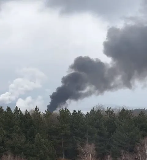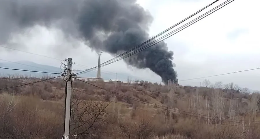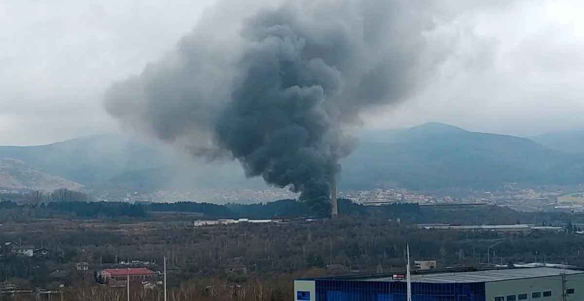 Гъст черен дим се издига в небето, като пламъците се виждат от различни части на града.