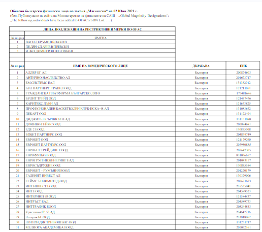 Министерството на финансите публикува списък на лицата, които попадат или потенциално биха попаднали в обхвата на санкциите, наложени от Службата за контрол на чуждестранните активи (OFAC) на Министерството на финансите на Съединените американски щати.