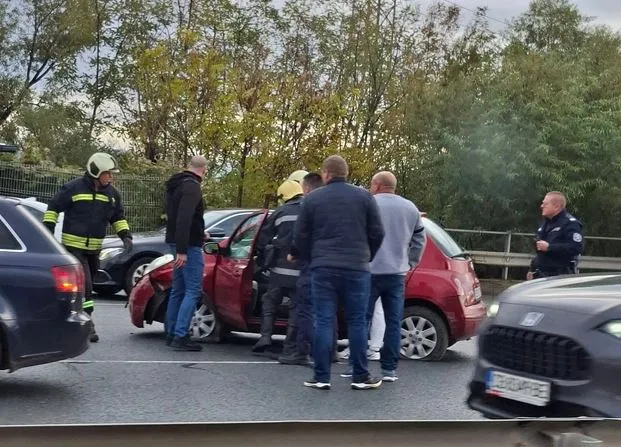Кола е спряна в средна лента, като по предницата ѝ има сериозни материални щети. На местопроизшествието са пристигнали огнеборци, които оказват съдействие.