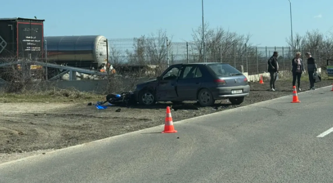 По първоначална информация двуколесното превозно средство и автомобилът са се сблъскали на пътния участък, като на място са изпратени екипи на полицията и Спешна помощ.