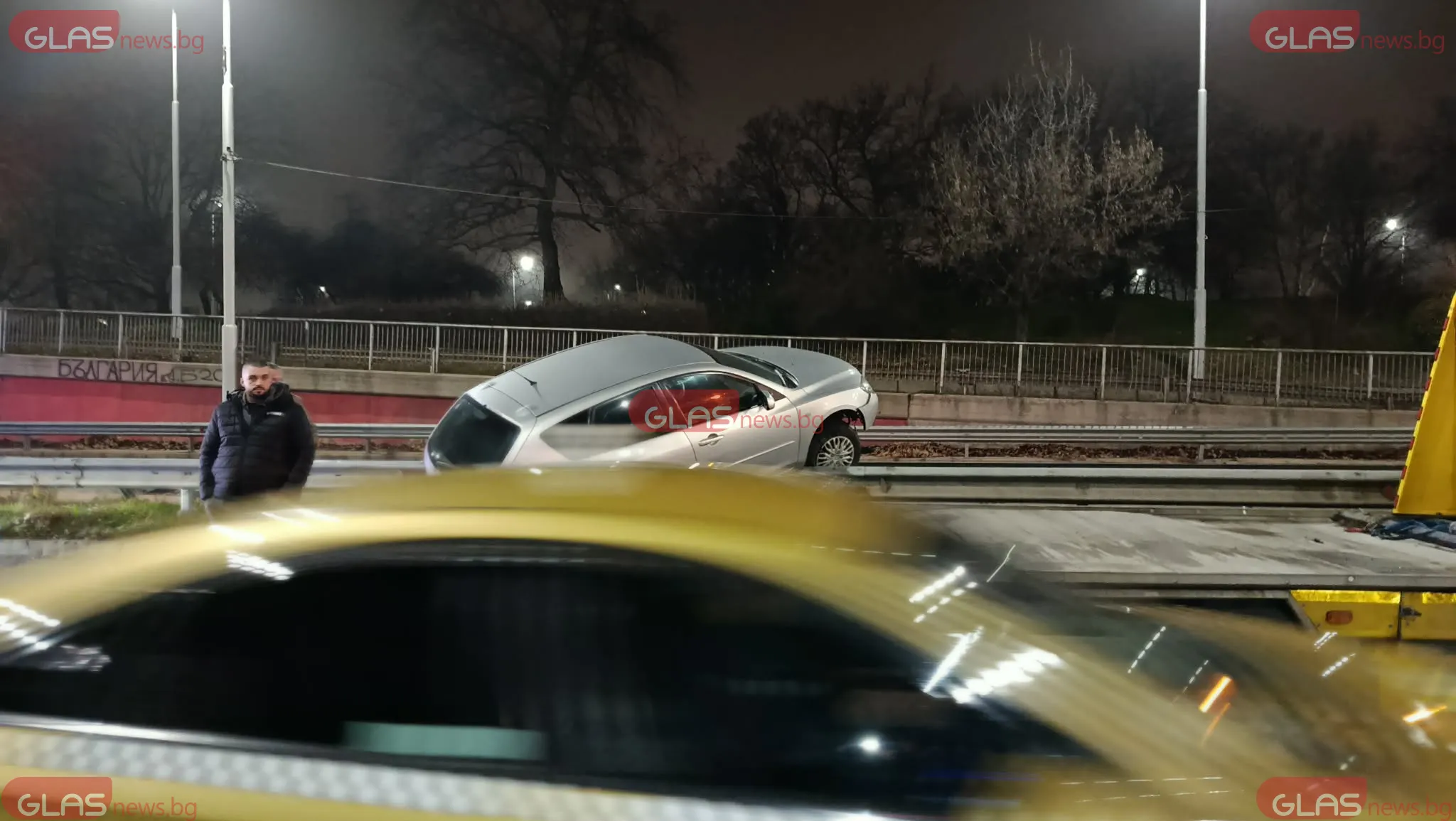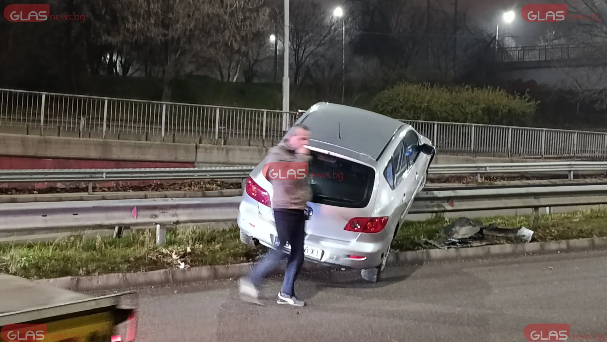 От кадрите се вижда как колата е излязла от платното и е попаднала върху мантинелата, като предната ѝ част е вдигната и заклещена върху разделителното съоръжение.
