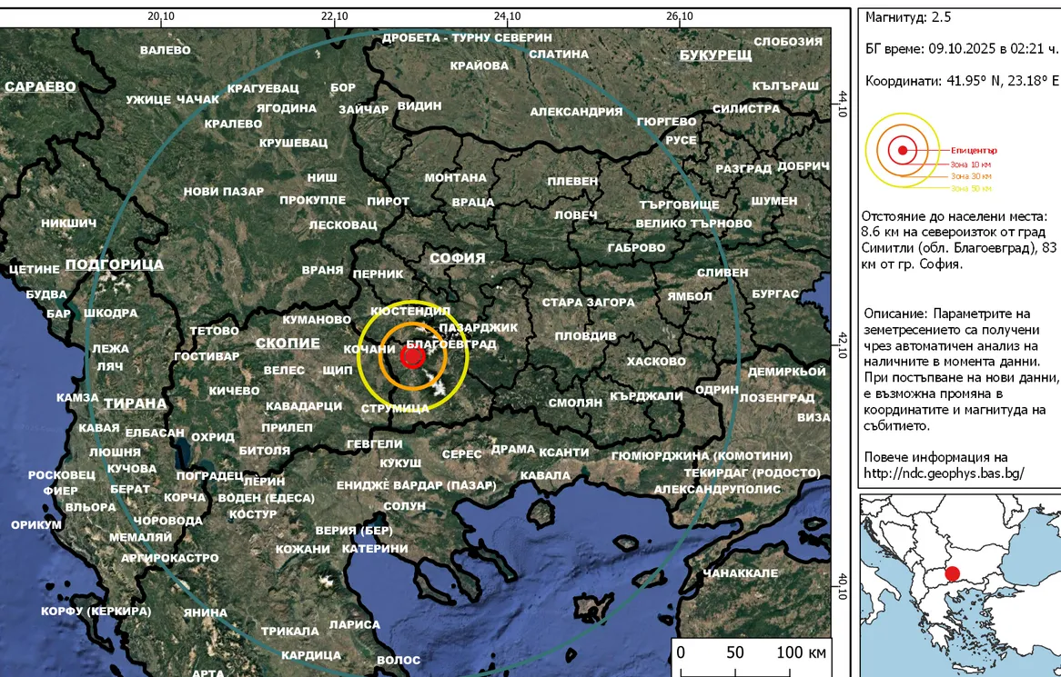 Трусът с магнитуд от 2,5 по Рихтер е отчетен на 8,6 километра североизточно от град Симитли.