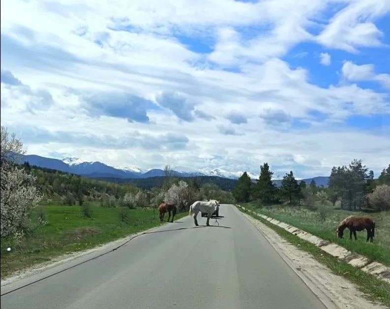 Стадо коне изскочило на пътя Ихтиман – Самоков. Някои от животните се мъдрели посредата на пътното платно, други спокойно пасяли от тревата около асфалта. Случката се разиграва посред бял ден, а за нея очевидец алармира в социалните мрежи на 28 април.