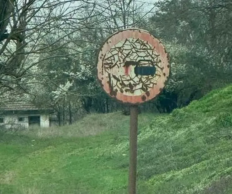 Снимката, която съпътства сигнала, показва силно увреден пътен знак, чиято повърхност е почти напълно разрушена. От оригиналната маркировка са останали само малки фрагменти, напукани и изронени, което прави символите върху него практически неразпознаваеми. Част от знака е закрита и с тъмно петно, а цялостният му вид създава усещане за дългогодишна липса на поддръжка. Разположен сред зеленина край пътя, той е почти невъзможен за правилно възприемане от водачите.