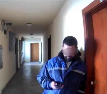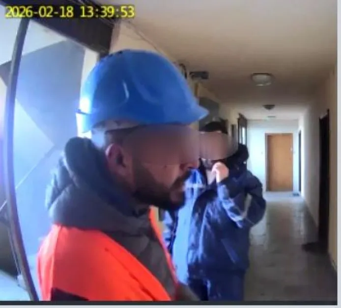 Димовска разпространява и кадри от охранителните камери във входа. На снимките се виждат двама мъже с работни дрехи, като единият е със сива каска. Според нея именно камерата я е алармирала навреме за присъствието им пред вратата на съседката ѝ.