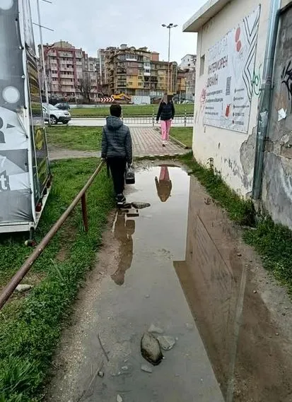 „Срам и позор – една пътека от сто метра не могат да направят вече много, много години. Всеки ден от там минават стотици деца и скачат в локвите и цял ден са с мокри крака“, пише Атанаска Ангелова.