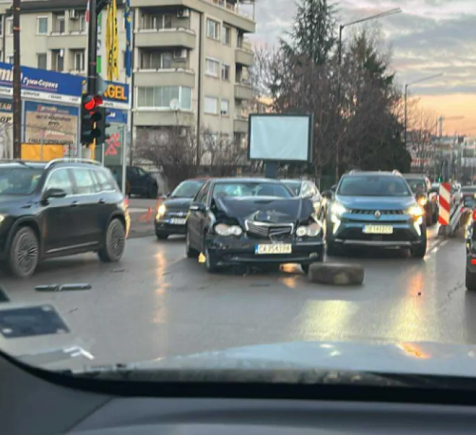 От удара се е откачила една от автомобилните гуми от кола, участваща в инцидента.