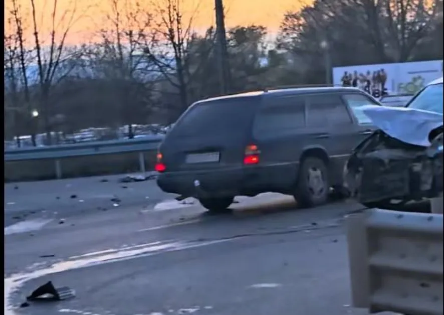 Лек автомобил е с разбита предница след сблъсък. По пътното платно има разпилени части, а сив джип е спрян на пътното платно.