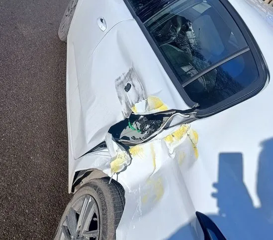 Лек автомобил е със сериозни щети след удара в релсовото превозно средство. Снимка, разпространена от гражданин, показва, че калникът на возилото буквално е раздран след сблъсъка.