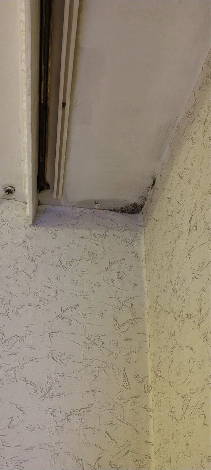 Други изображения показват тъмни петна от влага и мухъл в ъглите на помещения, включително около дограми и тръбни инсталации. На места се забелязват следи от продължително мокрене, което е довело до деформация на стенните покрития и увреждане на вътрешната облицовка.