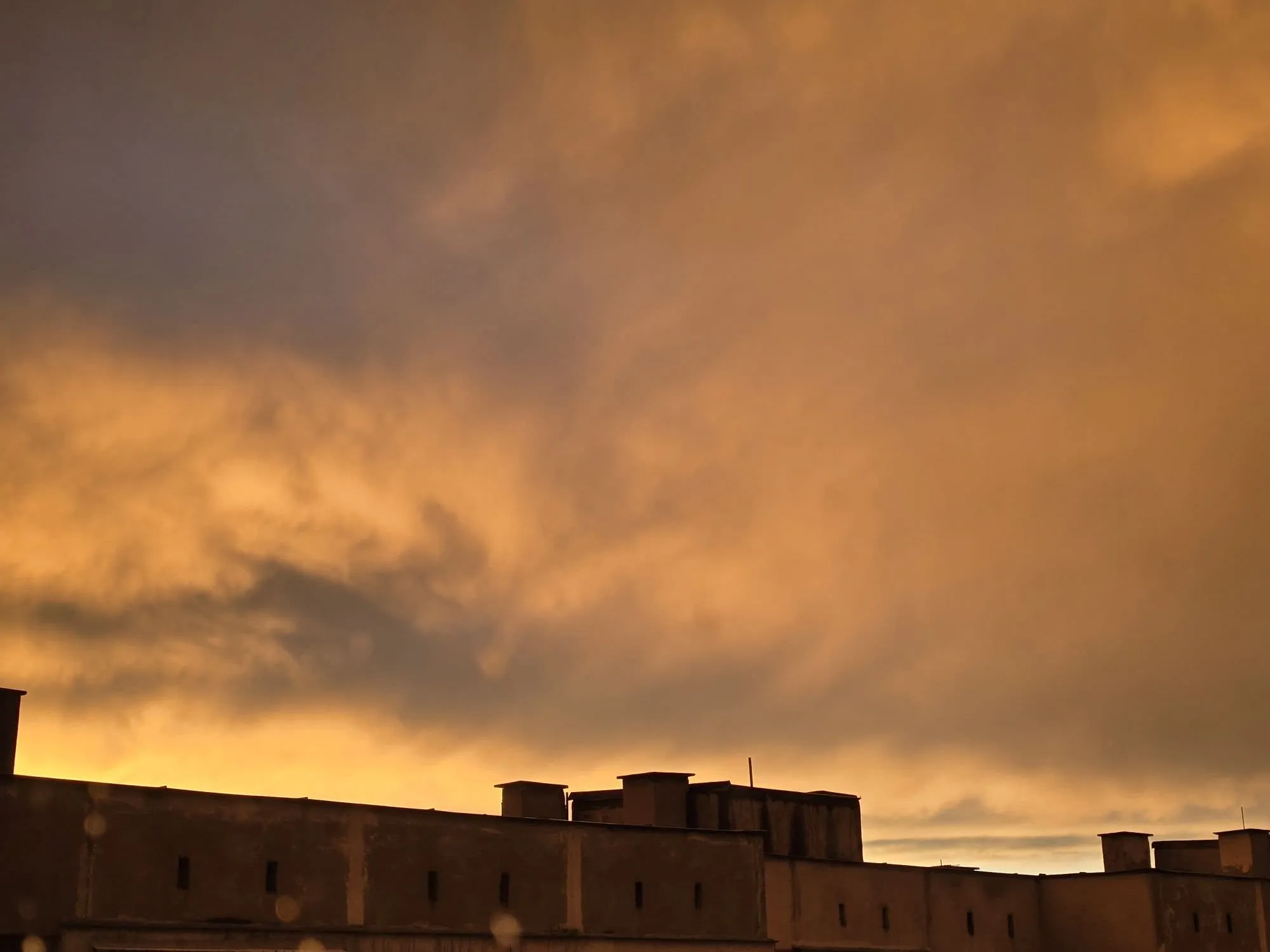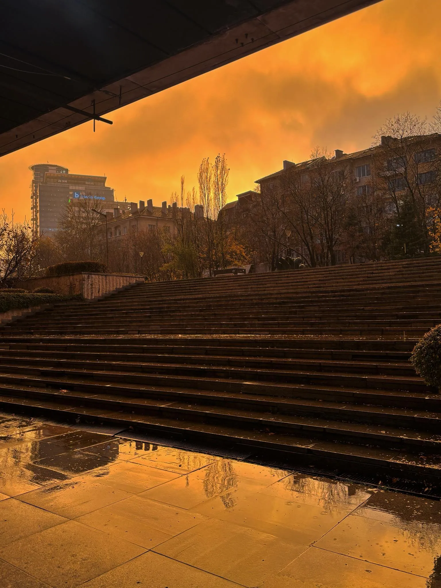Когато слънчевите лъчи преминават през плътните облаци под малък ъгъл, синята част от спектъра се разпада първа, а във въздуха остават топлите цветове – жълто, оранжево, червено. Така небето се превръща в пламтящ купол над града.