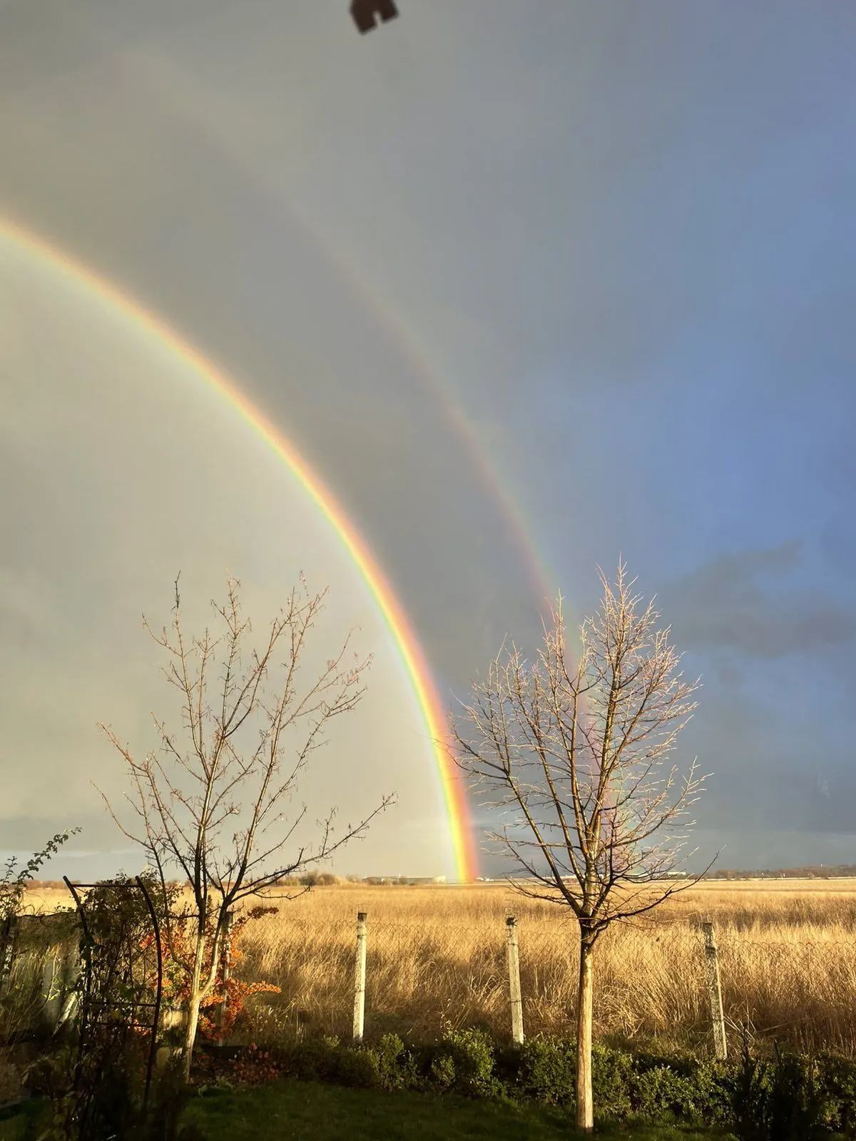 Първата дъга е ярка и ясна. Втората стои по-високо, е по-бледа и с цветовете в обратен ред – едно от най-красивите атмосферни явления.