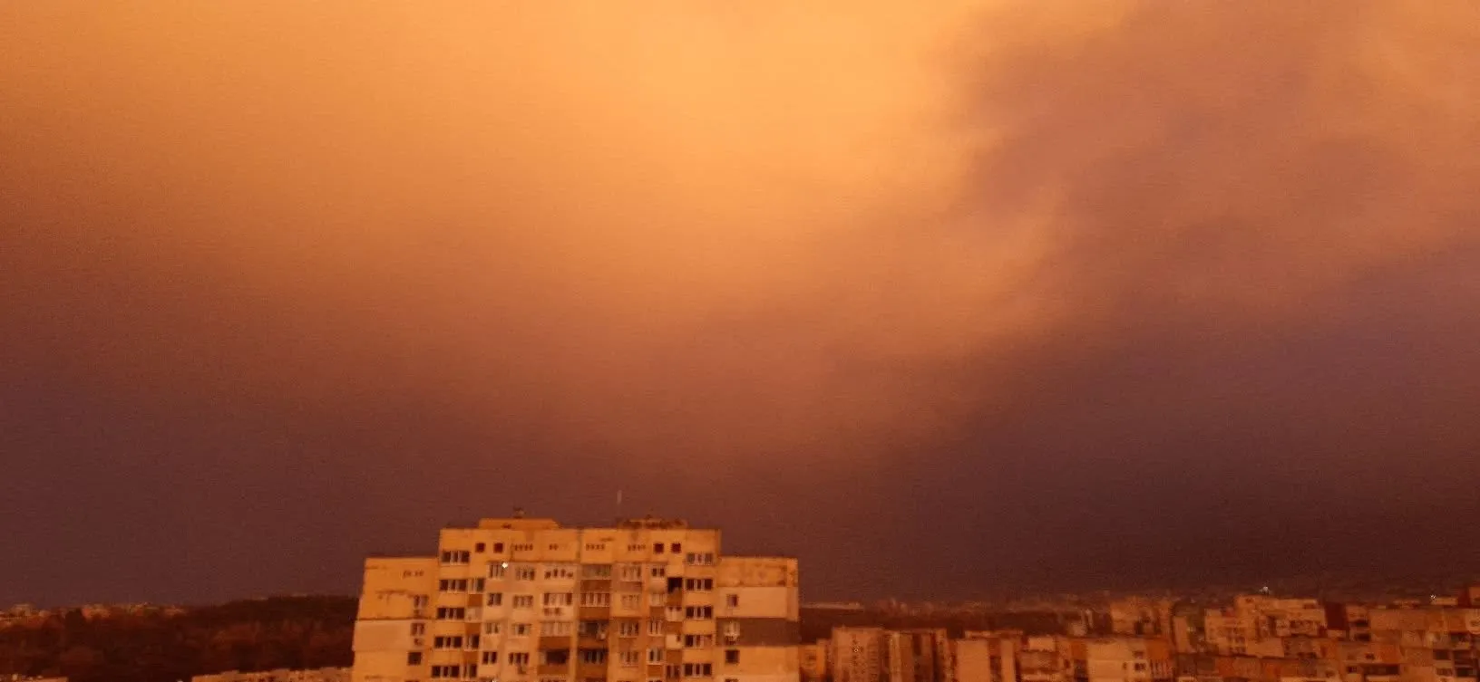 Само минути след ярката светлинна картина, небето над София потъмня необичайно рязко. Това се случва, когато преминава много плътна дъждовна или градова клетка, която засенчва слънцето като завеса.