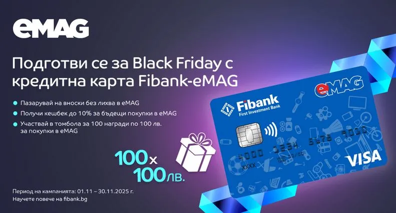 Всеки клиент на Първа инвестиционна банка, заявил и активирал кредитна карта Visa Fibank-eMAG в периода 01.11.2025 г. – 30.11.2025 г. и реализирал плащане с нея в сайта https://www.emag.bg/ до 30 ноември 2025 г., има възможност да спечели една от 100 награди, всяка от тях в размер на 100 лв. Наградите са под формата на лоялни точки (всяка точка = 1 лев) в профилите на клиентите в eMAG. Печелившите ще бъдат изтеглени през декември 2025 г.