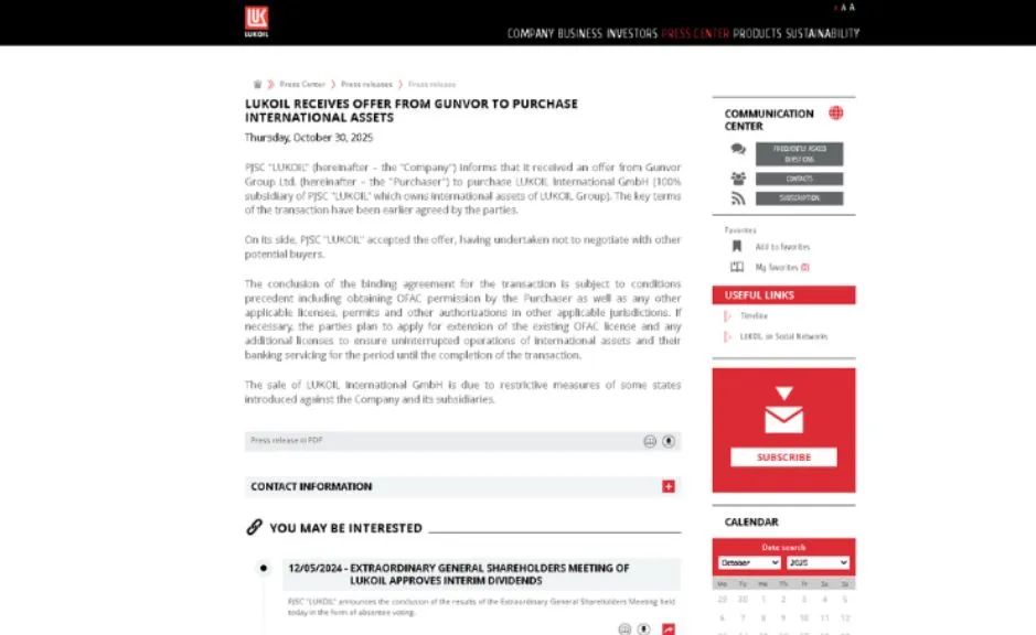В официалното съобщение на страницата на "Лукойл" се посочва, че продажбата на международните активи се налага заради въведени "ограничителни мерки" от някои държави, без да се посочва кои.