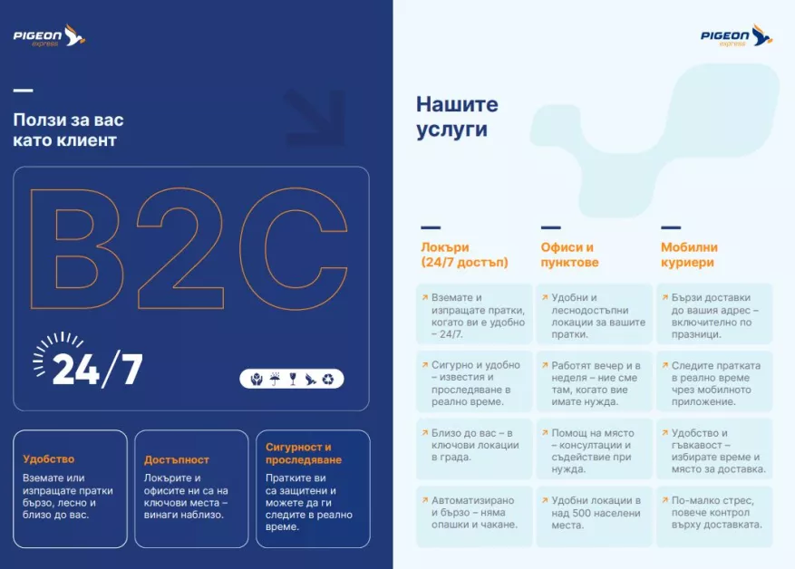 Данните от потребителското поведение са показателни: значителна част от пратките се търсят след 18:00 ч., а на пазара все още малко компании предлагат доставки в неделя и по празници. Именно тук PIGEON express позиционира една от ключовите си разлики – работа 7 дни в седмицата, включително неделя и празници.