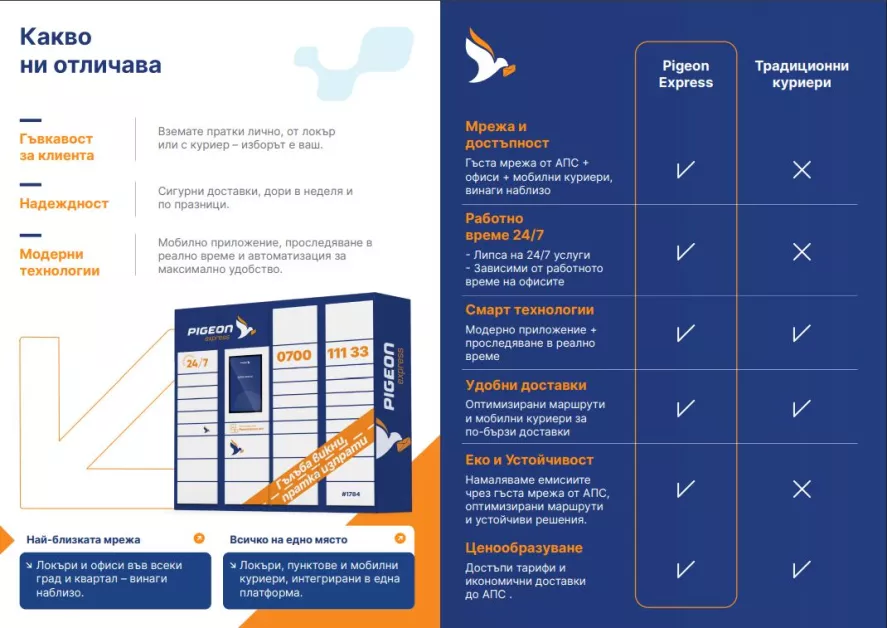 PIGEON express стартира ударно през пролетта с план за динамично разширяване на мрежата и услугите. Моделът обединява локъри 24/7, офиси и пунктове, мобилни куриери и технология, за да предложи доставка, която отговаря на съвременните очаквания за бързина, удобство и прозрачност.