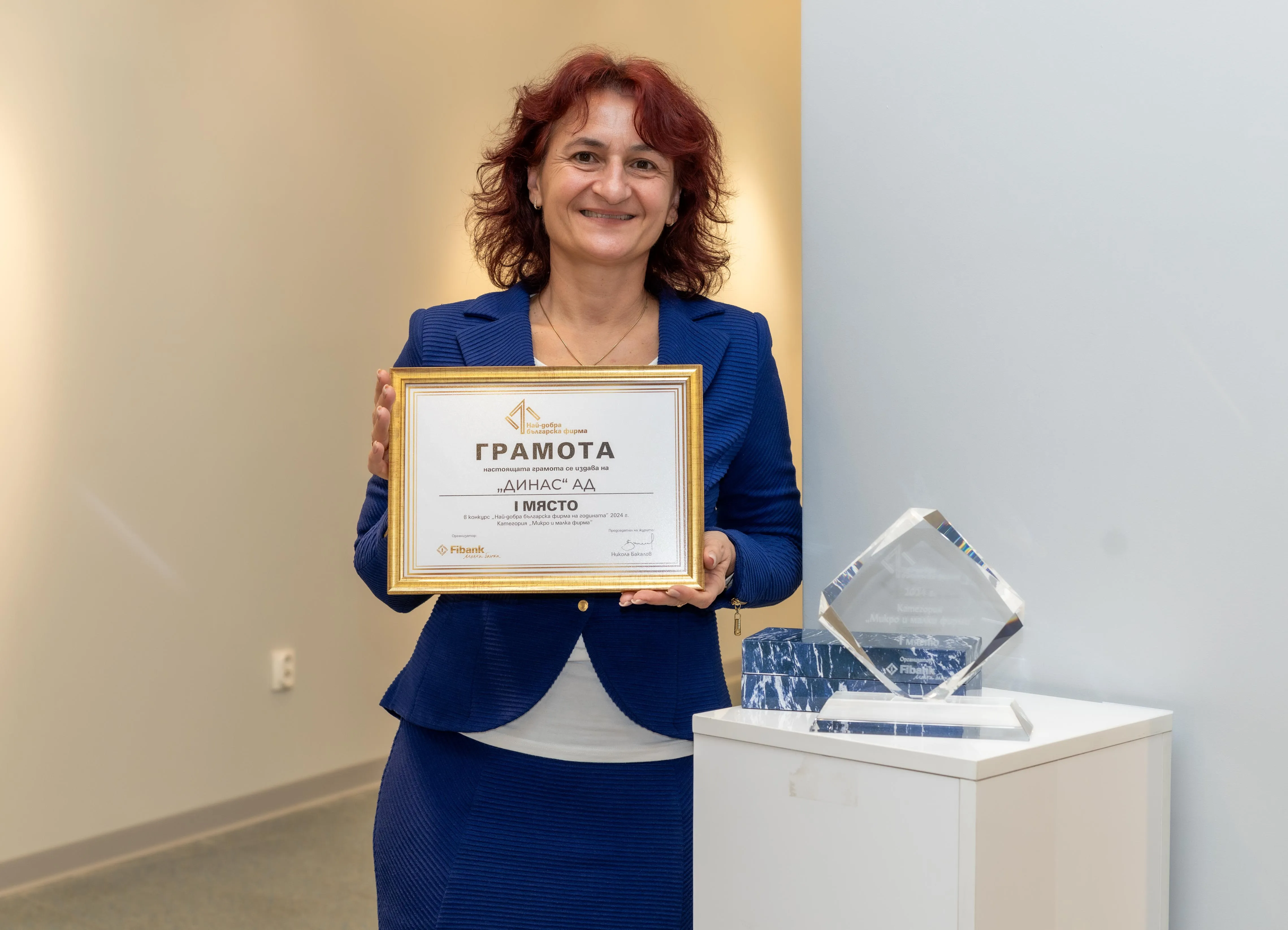 Победител в категорията „Микро и малка фирма“ стана Динас АД – сливенска компания за добив и преработка на рядката суровина кварцит, ползвана за огнеупорни материали в строителството и леярството. Нейни подгласници са варненското дружество 4М Енерджи ООД, специализирано в проектирането, изграждането и поддръжката на електрически уредби и съоръжения, и Глобал Тубер – фирма от Търговище, която се занимава с изкупуване и преработка на трюфели, диворастящи гъби и горски плодове.