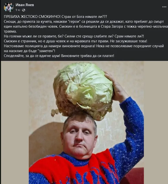 "На големи мъже ли се правите, бе? Силни сте срещу слабите ли? Срам нямате ли?! Смокин е странник, но е душа човек и на мравката път прави. Не заслужаваше това! Настояваме полицията да намери виновните веднага! Нека не позволяваме поредният случай на насилие да бъде "заметен"!", пише Иван Янев, който се обръща с гневна публикация в местна група във Facebook.