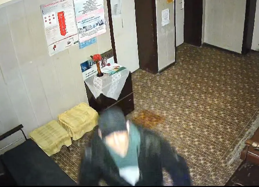 Кадри от охранителна камера са показали действията му в стаята. Той влиза през вратата и бързо се насочва към камерата, като за броени секунди успява да я неутрализира – насочва я към тавана, за да не може да заснеме действията му.