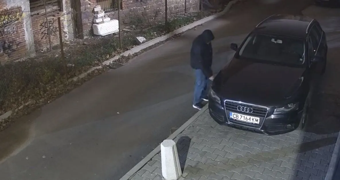 На няколко видеоклипа, заснети от охранителни камери, се вижда висок мъж с черно яке с качулка и светли дънки. Той се приближава към някои коли, като в ръцете си държи предмет, вероятно отвертка или нож. Посяга към една от гумите на „набелязаната“ машина, а после продължава по пътя си.