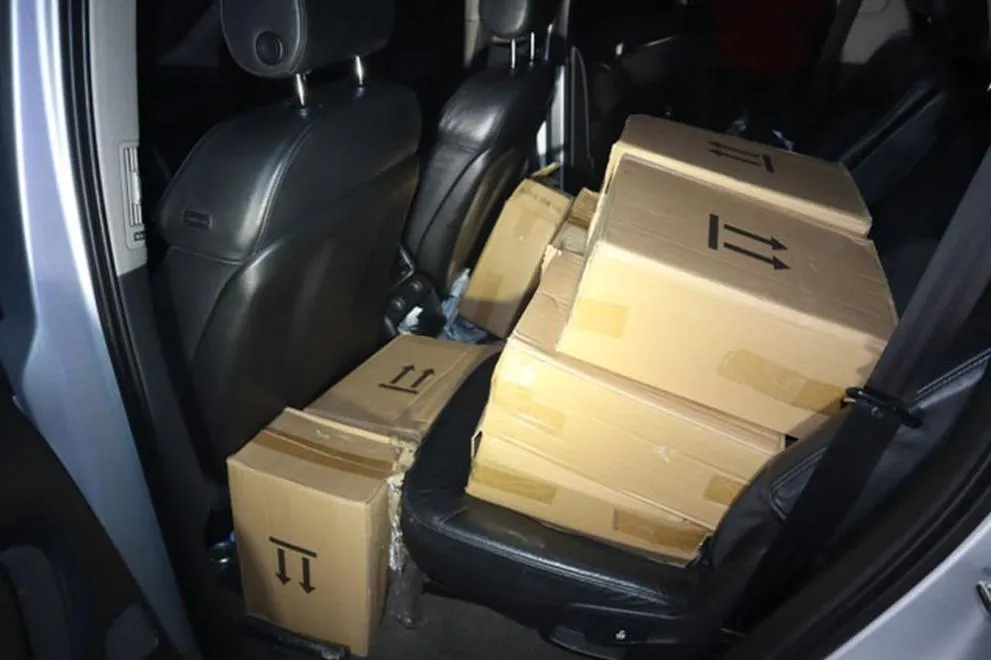 От колата са иззети 10 кашона с 57 флакона по 666 грама диазотен оксид (райски газ) и найлонов плик с 63 пластмасови накрайници.