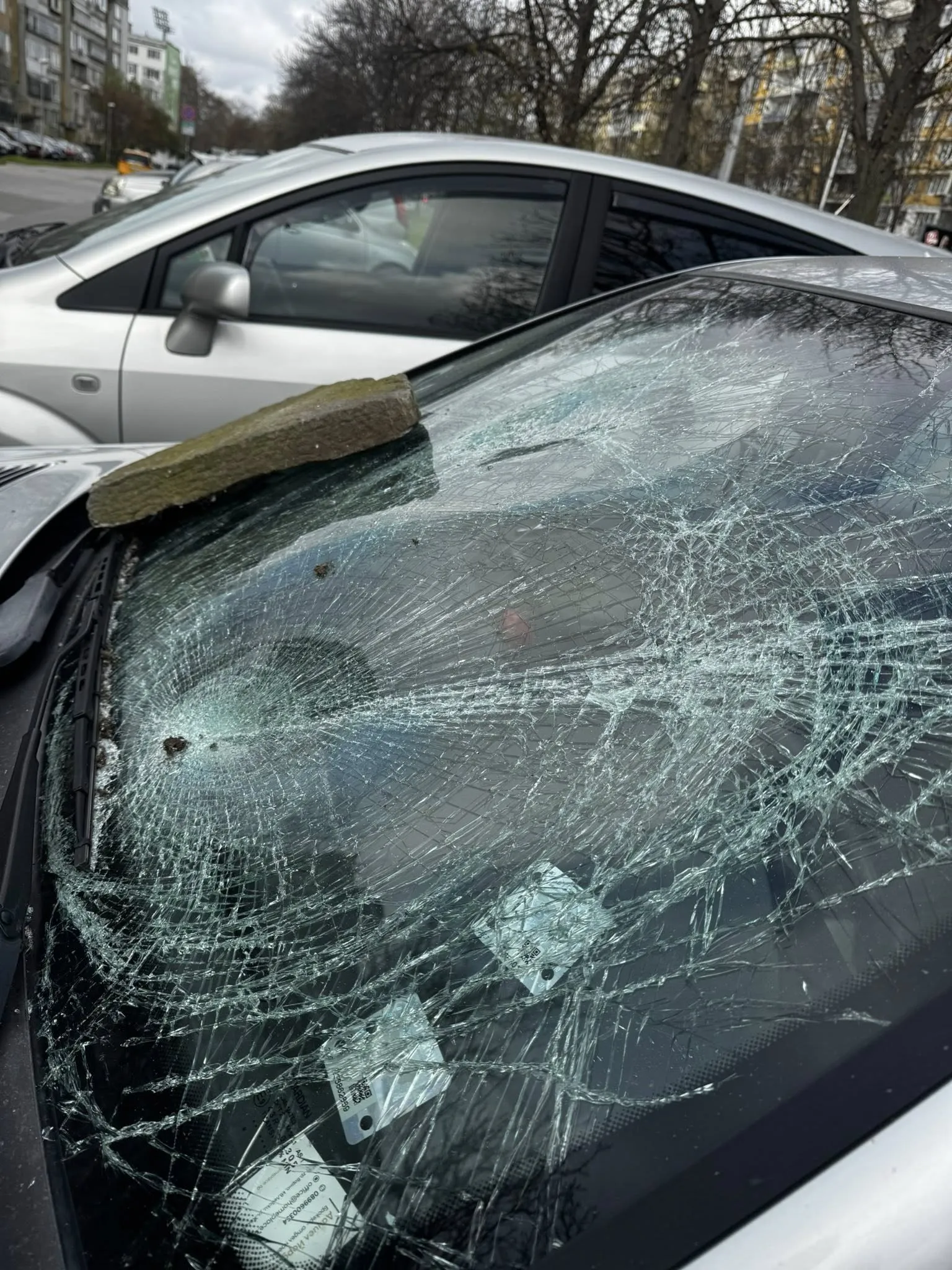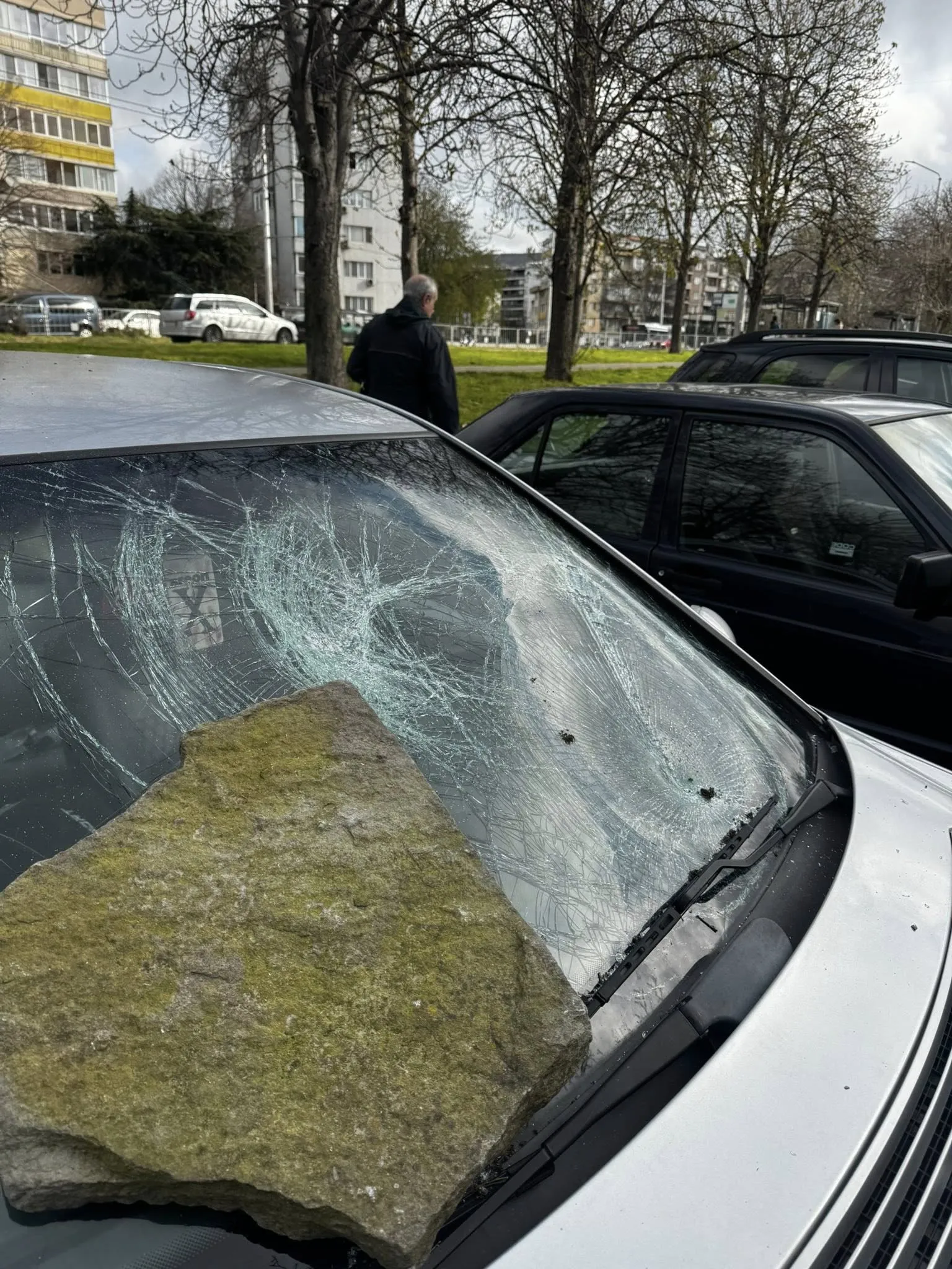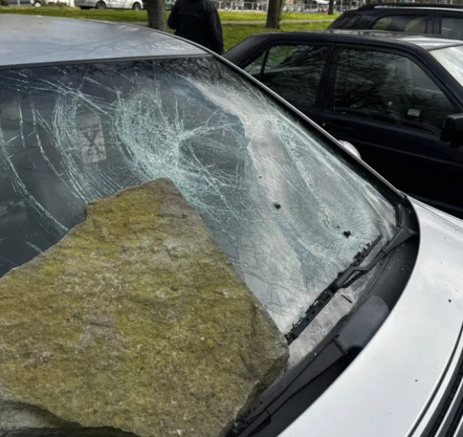 Инцидентът е станал в квартал „Чайка“, където колата е била паркирана. На кадрите се вижда разбито предно стъкло, като върху него е хвърлен голям камък.