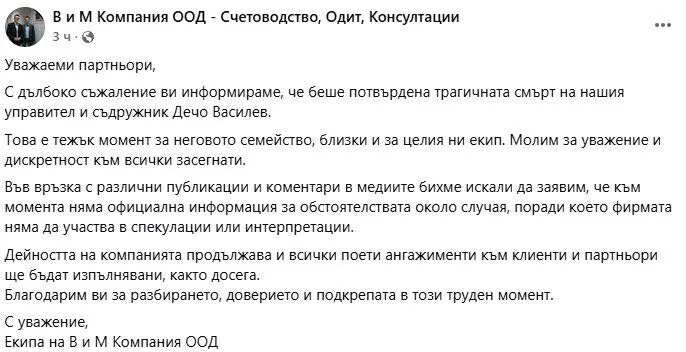 „Уважаеми партньори, С дълбоко съжаление ви информираме, че беше потвърдена трагичната смърт на нашия управител и съдружник Дечо Василев. Това е тежък момент за неговото семейство, близки и за целия ни екип. Молим за уважение и дискретност към всички засегнати. Във връзка с различни публикации и коментари в медиите бихме искали да заявим, че към момента няма официална информация за обстоятелствата около случая, поради което фирмата няма да участва в спекулации или интерпретации. Дейността на компанията продължава и всички поети ангажименти към клиенти и партньори ще бъдат изпълнявани, както досега. Благодарим ви за разбирането, доверието и подкрепата в този труден момент.