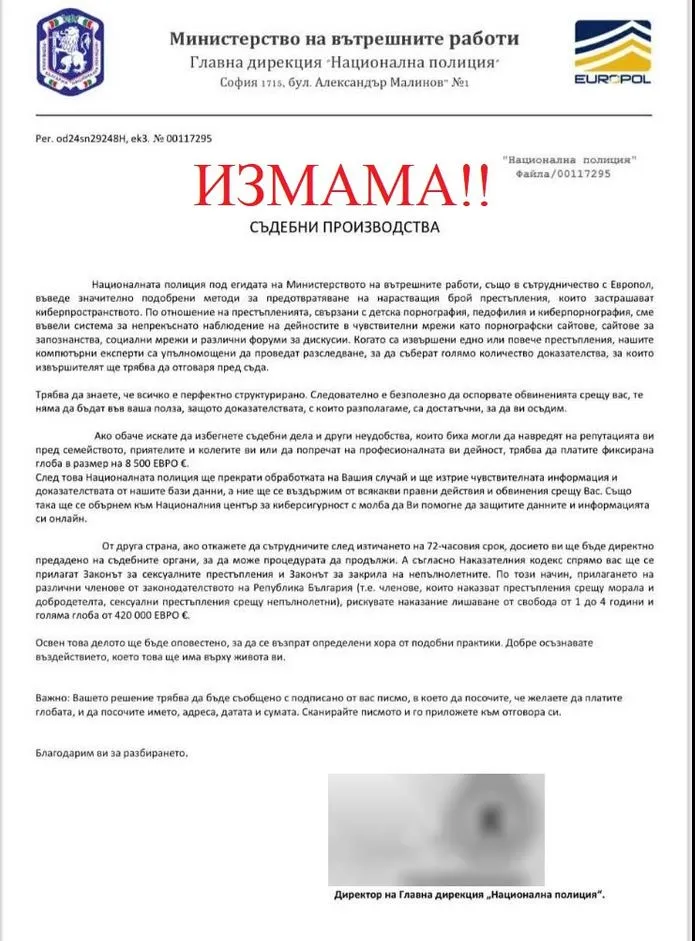 В съобщенията, озаглавени „Съдебни производства“, измамниците се представят за служители на МВР и използват логата на институциите, герба на полицията и дори подписа на бивш директор на ГДНП, за да придадат достоверност.