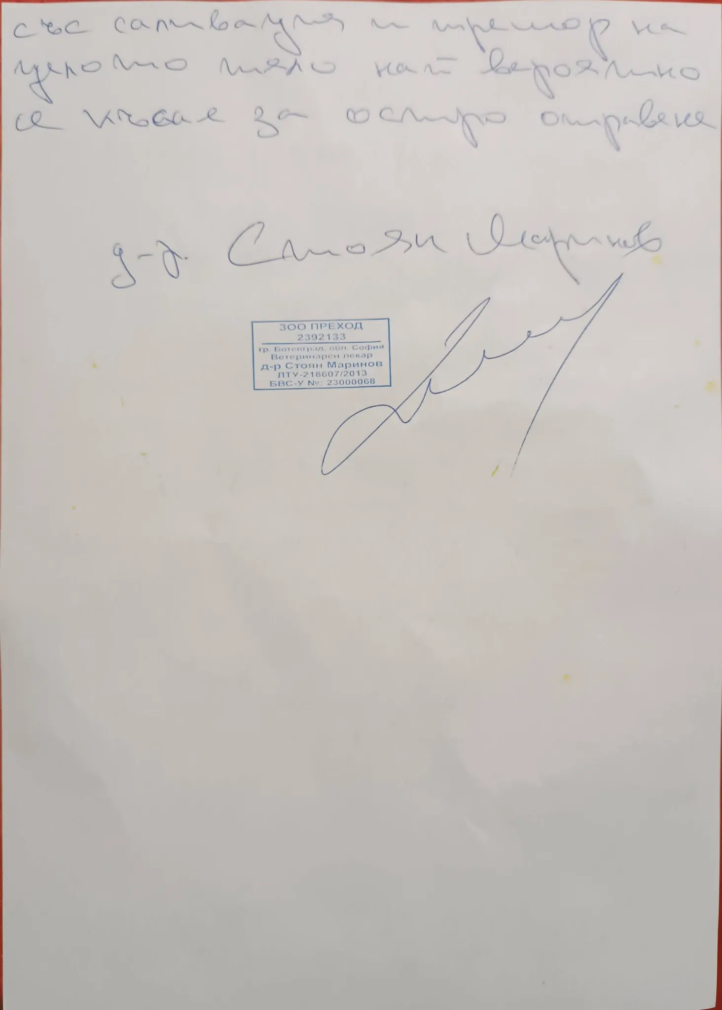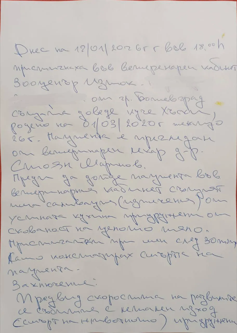 По думите ѝ кучето не е напускало имота и не е имало достъп до опасни места. Ветеринарният лекар, прегледал животното, е установил, че то е отровено силно токсичен растителен препарат или пестицид, който действа изключително бързо. Според специалиста при този тип отрови практически няма време за реакция, за разлика от други токсични вещества, при които все пак съществува шанс за спасяване.