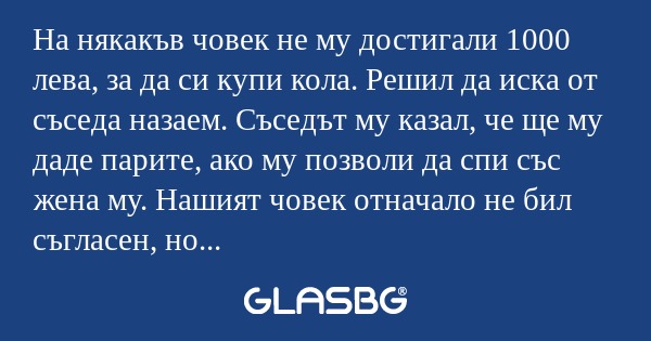 На някакъв човек не му достигали 1000 лева, за да си купи кола. Решил да иска от съседа назаем. Съседът му казал, че ще му даде парите, ако му позволи да спи със жена му. Нашият човек отначало не бил съгласен, но като размислил малко, решил, че за хиляда лева няма какво толкова да му мисли и решил да пусне жена си. След като всичко свършва и жената се връща вкъщи, мъжът и я пита: