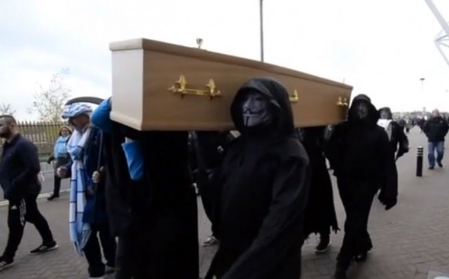 Феновете на английския Ковънтри намериха интересен начин да протестират срещу собствениците на клуба от Sisu. Преди домакинския двубой от Лига 1 срещу МК Донс привържениците направиха траурно шествие, с което символично погребаха своя клуб. Феновете бяха облечени в траурни одежди и маски и дори носеха ковчег. Привържениците на Ковънтри не са доволни от управлението на клуба, който се намира в зоната на изпадащите в Лига 1. I'm at the Ricoh where @covfans2gether have arranged a funeral procession mourning the 'death' of #ccfc pic.twitter.com/LEJn9mesp0 — Laura Hartley (@LauraCovTel) November 26, 2016 Коментирай