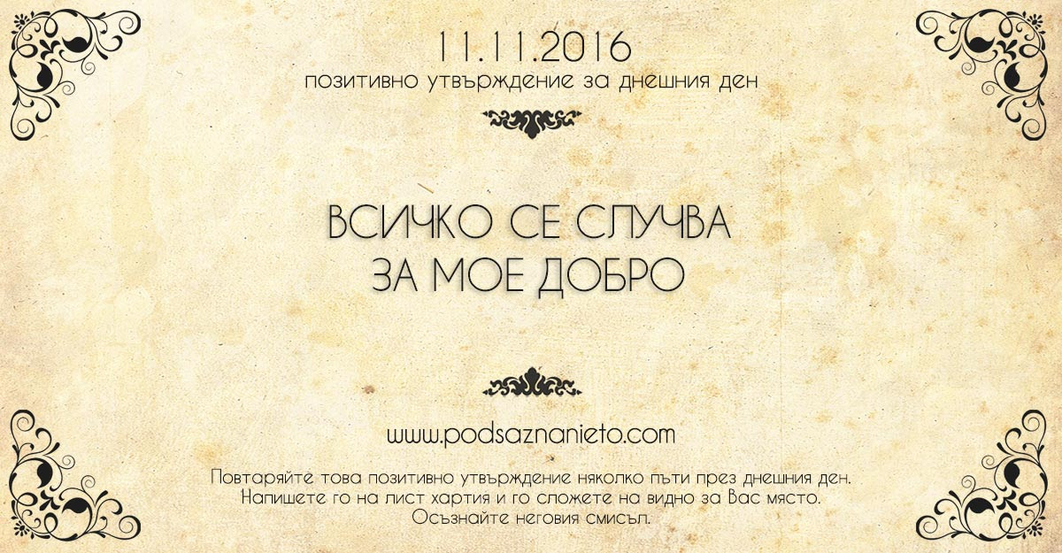 Позитивно намерение за 11 ноември 2016 GlasNews.bg 23:09 10.11.16 0 2486 Позитивно намерение за 11 ноември 2016 Последвайте ни в: Прочетете още 00:01 Христос воскресе! И дали възкресихме човечността в себе си? 08:00 Най-красивите великденски пожелания, които ще стоплят всяко сърце 17:00 Турист се натъкна на мечка в Стара планина ВИДЕО 16:01 Лекар предупреждава: не допускайте тази грешка по Великден