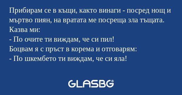 Прибирам се в къщи, както винаги - посред нощ и мъртво пиян, на вратата ме посреща зла тъщата. Казва ми:
