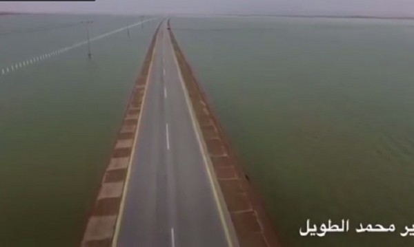 Проливни дъждове превърнаха в море пясъчните полета северно от саудитската столицата Рияд. За късмет на местните, единственият главен път в района е изграден на по-голяма височина и остана проходим за автомобили.