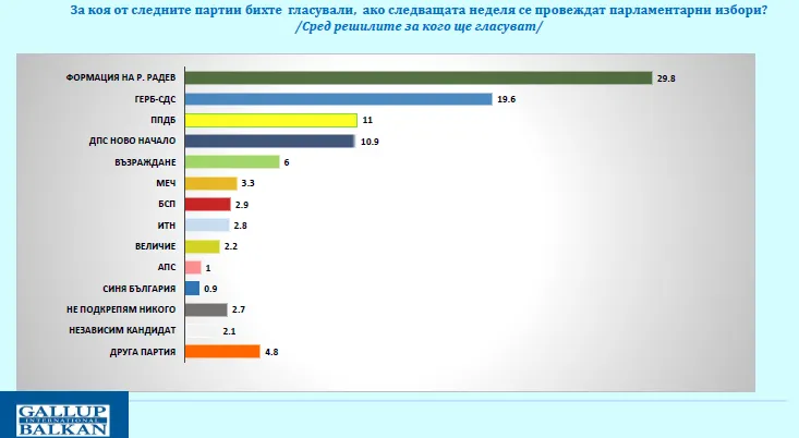 Сред избирателите, които вече са решили за кого ще гласуват, формацията на Румен Радев получава 29,8% подкрепа. Това я поставя на първо място, макар и засега без достатъчно подкрепа за самостоятелно парламентарно мнозинство.