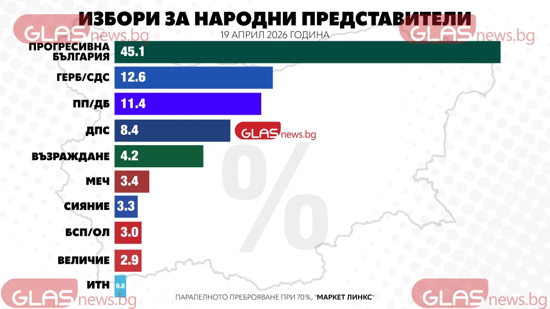 Политическите формации, които влизат в 52-ия парламент, според данните при 50% паралелно преброяване на социологическата агенция "Маркет линкс":