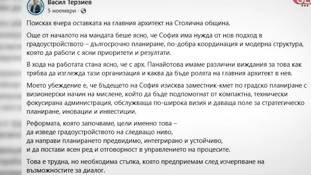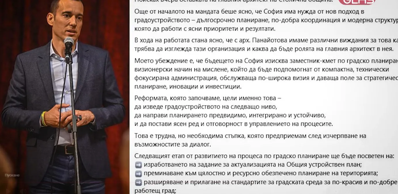 Оставката на арх. Панайотова е поискана чрез SMS, докато тя е била в болница с тежка пневмония, а кметът – в чужбина. „Това не е само недостойно, а несериозно и необмислено“, казва тя и подчертава, че именно поради липсата на конкретни обвинения е отказала да подаде оставка. До момента, по думите ѝ, реален разговор за мотивите на искането не е провеждан. Ключов момент в конфликта се оказва формирането на нова структура в Столична община. По думите на архитект Богдана Панайотова, тя е изготвена без нейно участие и без коментар от директорите на дирекции.
