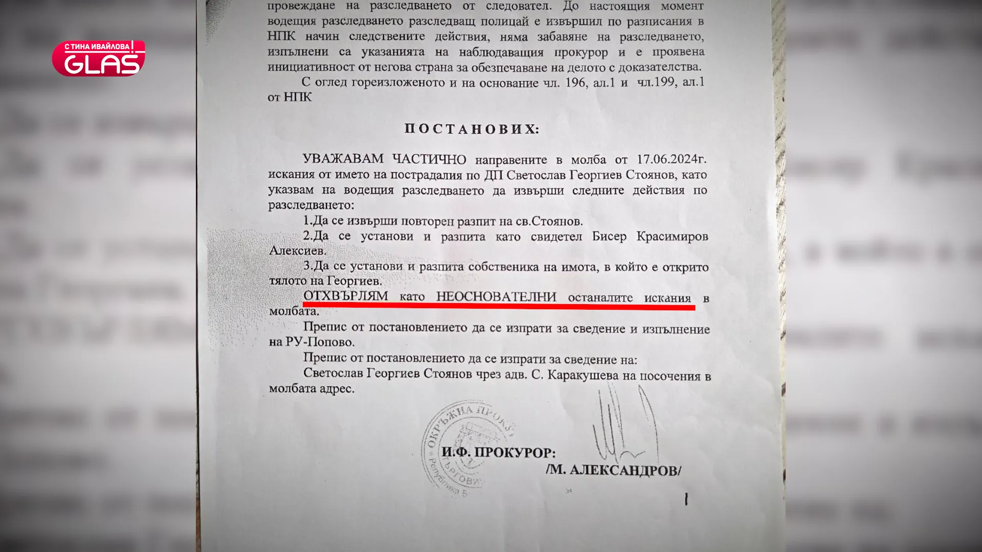 „Ние вярвахме, че ще се случи нещо. Оттам мина, мина колко дни, ние ходихме при Русева. От Русева отидохме при прокурора.“, допълни Светослав Стоянов.