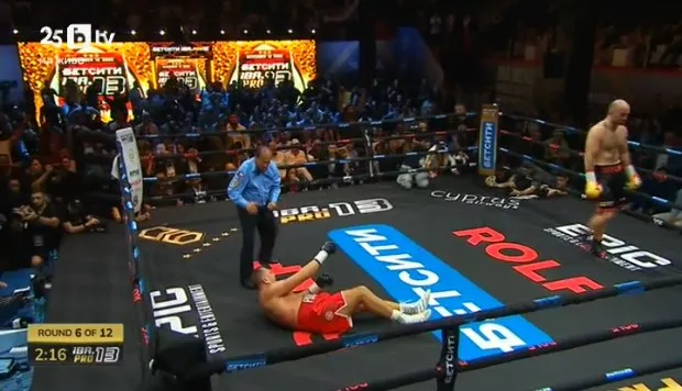 В началото на шестия рунд обаче Гасиев реализира комбинация десен-ляв, като с втората част от нея пласира ляво кроше право в брадичката на Пулев. Българинът падна на пода и секунди по-късно съдията на ринга сложи край на срещата.