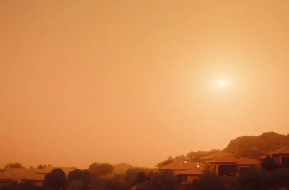 Поради пречупването на слънчевата светлина от праховите частици, небето е придобило необичаен червено-оранжев оттенък.