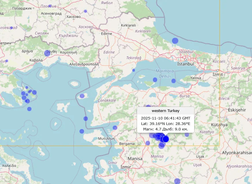 Серия от земетресения бе регистрирана тази сутрин, 10 ноември 2025 г., в западната част на Турция.