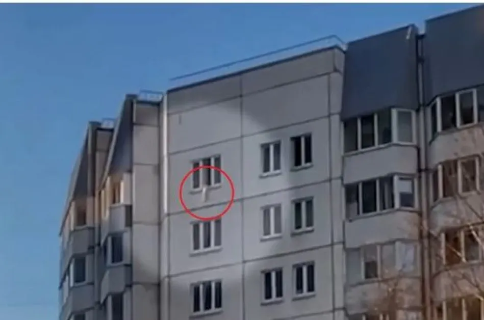 Шокиращи кадри показват как малкото дете стои опасно на перваза на прозорец на жилищен блок в Санкт Петербург, Русия.