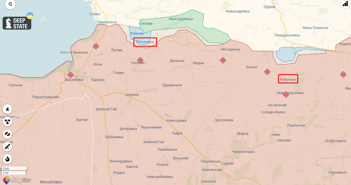 Въоръжените сили на Украйна контролират населените места Пятихатки, южната част на Роботино в Запорожка област и Урожайное в Донецка област. Съответното изявление на ръководителя на руската ЧВК "Вагнер" Евгений Пригожин беше публикувано на 21 юни в социалните мрежи от неговата пресслужба.