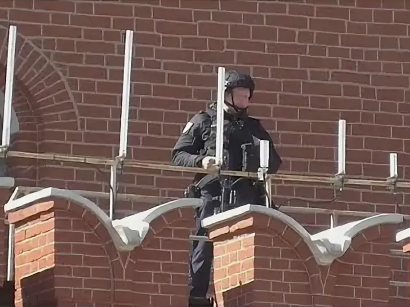 Както съобщава EADaily.com, служители на ФСО (Федералната служба за охрана) в пълно снаряжение и въоръжени с автоматични оръжия са заели позиции по протежение на Кремълската стена, на трибуните на Мавзолея са разположени въоръжени постове, а служители на Росгвардия с маски и бронежилетки дежурят на Червения площад.