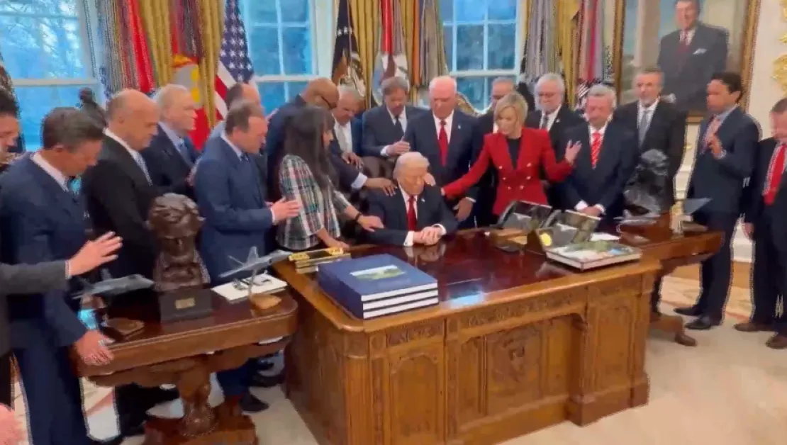 Той седеше на бюрото си, а пасторите го бяха наобиколили с ръце, поставени върху раменете му и хванати един за друг. Един от тях произнесе молитва: „Господ да дава здраве и сила на Тръмп да ръководи страната, както и да пази войниците на Съединените щати зад граница”.