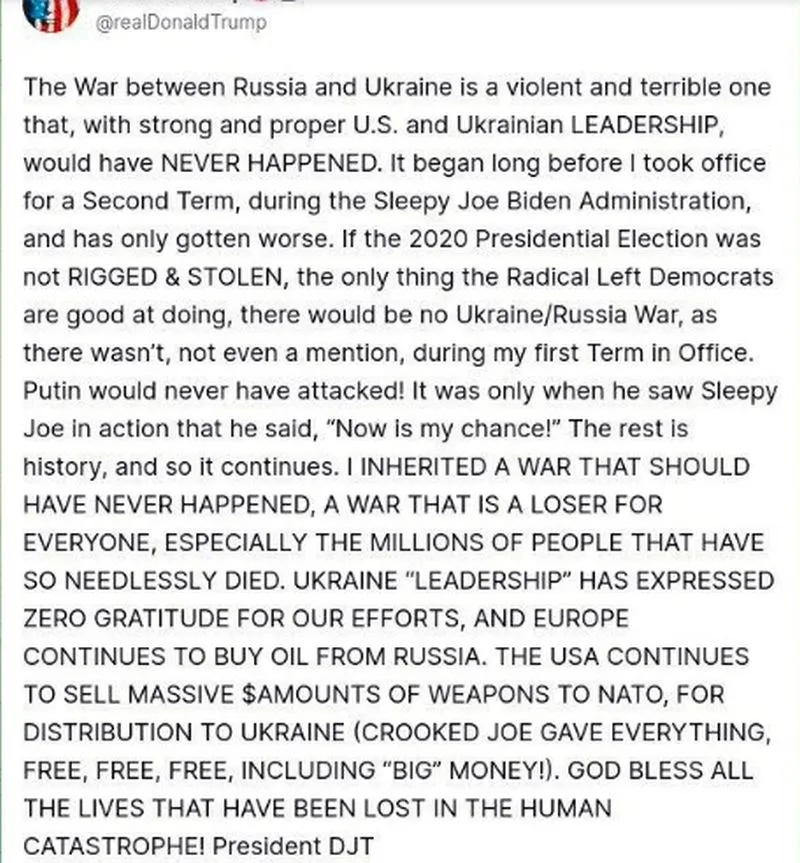 „Войната между Русия и Украйна е жестока и ужасна, и при силно и правилно ръководство от страна на САЩ и Украйна НИКОГА нямаше да се случи. Тя започна много преди да встъпя във втория си мандат, по време на администрацията на Сънливия Джо Байдън, и само се влошаваше. Ако президентските избори през 2020 г. не бяха МАНИПУЛИРАНИ И ОТКРАДНАТИ – единственото нещо, в което радикалните демократи са добри – нямаше да има война между Украйна и Русия, както нямаше, нямаше дори и споменаване за такава по време на първия ми мандат. Путин никога нямаше да нападне! Едва когато видя Сънливия Джо в действие, каза: „Сега ми е шансът!“ Останалото е история, и така продължава.