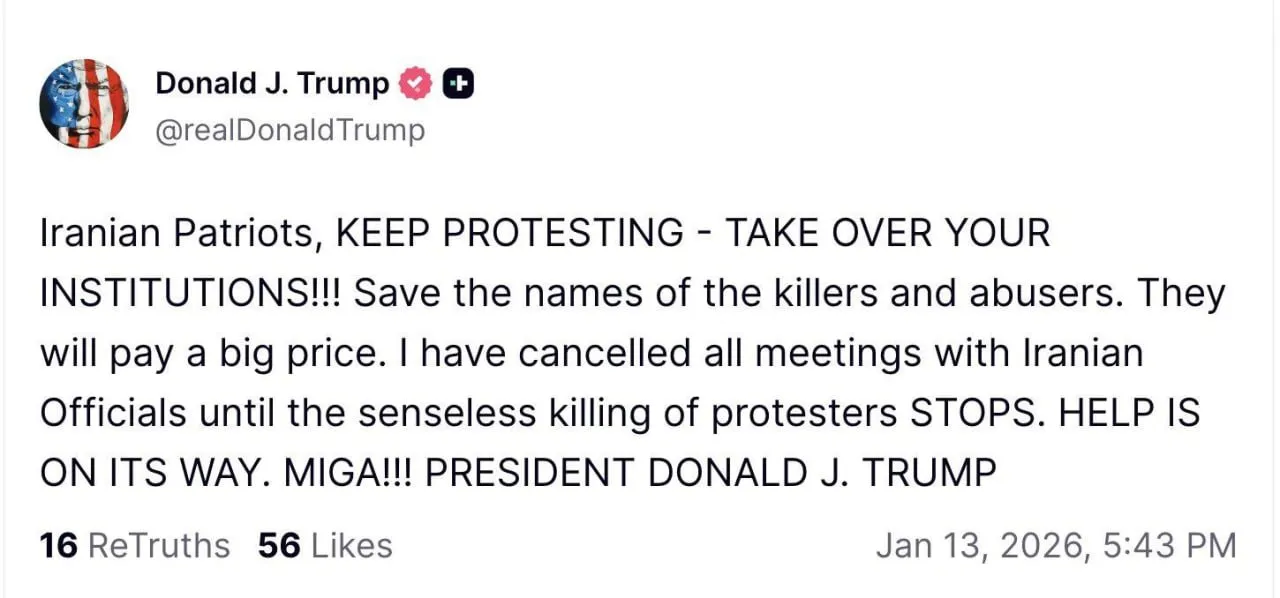 Президентът на САЩ Доналд Тръмп призова иранските протестиращи да продължат демонстрациите си. Той призова за завземане на правителствени институции в цялата страна. Това той направи в профила си в социалните мрежи, Trump Truth.