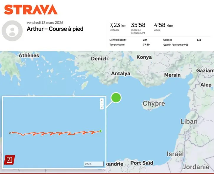 Местоположението на самолетоносача „“ е било разкрито край Кипър, след като млад военноморски офицер е публикувал своя 36-минутна тренировка в публичния си профил в приложението Strava. Така всеки е могъл да проследи в реално време позицията на кораба и придружаващия го флот, съобщава френското издание Le Monde.
