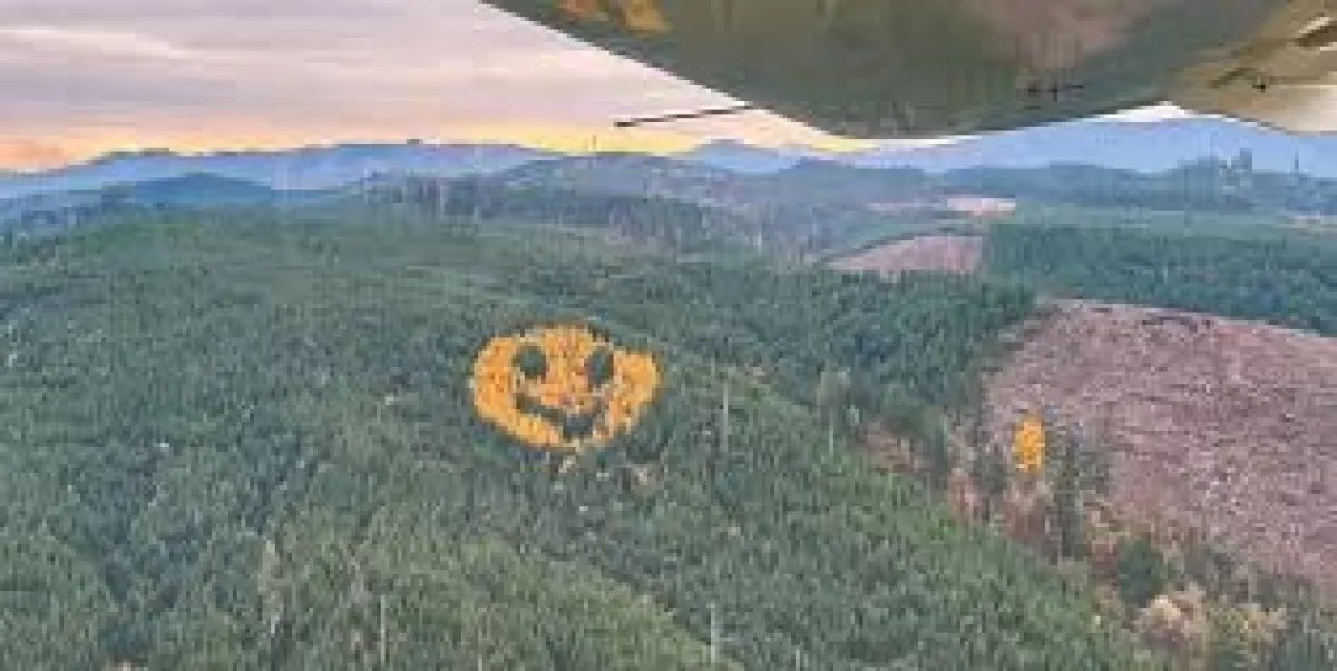 Ако пътувате по магистрала 18 в щата Орегон, САЩ — или прелитате над района — може да забележите нещо напълно неочаквано: огромно жълтеникаво усмихнато лице, оформено насред гъста зелена гора. Гледката изглежда като оптична илюзия, но всъщност е напълно умишлено създадена.